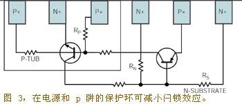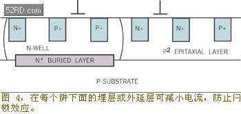 你可使用CMOS布局技術來防止閂鎖效應,因為CMOS布局技術可監控ESD瞬變會進入器件的各部位:器件的電源引腳、輸入引腳和輸出引腳。你應降低晶體管(PNP和NPN)的增益,并提高閂鎖效應的閾值,方法是加大器件結構中P溝道Tub與P溝道漏極之間的間隔。在電源和p-tub上連接p+和n+保護環也可以降低晶體管增益,提高閂鎖效應的閾值(圖3)。防止閂鎖效應的其他工藝技術有:提高阱深度以減少寄生晶體管的增益;采用絕緣襯底(如藍寶石硅)以降低tub和襯底中的電流,;在每個阱下面采用埋層或外延層(圖4)。
