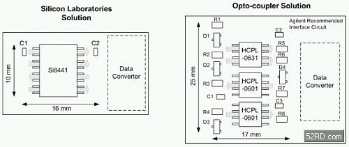 圖5:光耦合器與數字隔離元件的布局比較