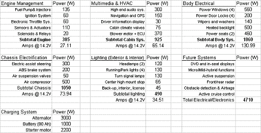 關(guān)于該表要注意的最后一點是:如果考慮車身電子、照明和底盤電子等子系統(tǒng)的間歇性負(fù)載,對汽車充電系統(tǒng)的需求就真的是附件超載(accessoryoverload)。將來的系統(tǒng)將持續(xù)這種趨勢。