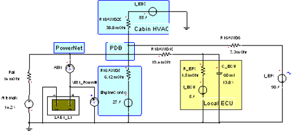 在上圖中,汽車充電系統(tǒng)由交流發(fā)電機和鉛酸電池來表示。在這種情況下,要利用Ansoft公司的汽車工具箱之中的Simplorer電化學(xué)建模工具對電池進(jìn)行比較詳細(xì)的建模。PowerNet被高度簡化為由線規(guī)電阻建模的四個分支電路,包括引擎控制、車箱氣候控制、本地ECU和EPS(最右邊)。PowerNet分配點被標(biāo)注為PDB或電力分配箱。