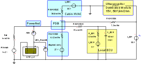 上圖與前一張PowerNet電路圖相同,但是,增加了放置在EPS負(fù)載點的超級分布式模塊。這個超級模塊是一個標(biāo)準(zhǔn)的汽車設(shè)計產(chǎn)品,它在大的用電負(fù)載附近像電池一樣提供穩(wěn)定和平滑的PowerNet。所有其它地方一樣,存在超級分布式模塊的地方,就可以容易地在PowerNet和ECU電壓上觀察到平滑作用。