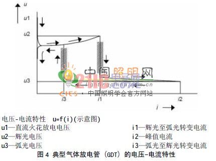 由于浪涌干擾所致,一旦加在氣體放電管兩端的電壓超過火花放電電壓(圖4的u1)時,放電管內部氣體被電離,放電管開始放電。放電管端的壓降迅速下降至輝光放電電壓(圖4的u2)(u2在表2中的數值為140V或180V,與管子本身的特性有關),管內電流開始升高。隨著放電電流的進一步增大,放電管便進入弧光放電狀態。在這種狀態下,管子兩端電壓(弧光電壓)跌得很低(圖4的u3)(u3在表2中數值為15V或20V,與管子本身的特性有關),且弧光電壓在相當寬的電流變動范圍(從圖4的i1→i2過程中)內保持穩定。因此,外界的高電壓浪涌干擾,由于氣體放電管的放電作用,被化解成了低電壓和大電流的受保護情況(u3和i2),且這個電流(從圖4的i2→i3)經由氣體放電管本身流回到干擾源里,免除了干擾對燈具可能帶來的危害。隨著浪涌過電壓的消退,流過氣體放電管的電流降到維持弧光放電狀態所需的最小值以下(約為10mA~100mA,與管子本身的特性關),弧光放電便停止,并再次通過輝光放電狀態后,結束整個放電狀態(熄弧)。