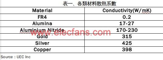 就LED芯片承載基板的發(fā)展上,以承載芯片而言,傳統(tǒng)PCB的基板材質(zhì)具有高度商業(yè)化的特色,在LED發(fā)展初期有著相當(dāng)?shù)挠绊懥ΑH欢S著LED功率的提升,LED基板的散熱能力,便成為其重要的材料特性之一,為此,陶瓷基板逐漸成為高效能LED的主要散熱基板材料(如表一所示),并逐漸被市場(chǎng)接受進(jìn)而廣泛使用。近年來(lái),除了陶瓷基板本身的材料特性問(wèn)題須考慮之外,對(duì)基板上金屬線路之線寬、線徑、金屬表面平整度與附著力之要求日增,使得以傳統(tǒng)厚膜工藝備制的陶瓷基板逐漸不敷使用,因而發(fā)展出了薄膜型陶瓷散熱基板,本文將針對(duì)陶瓷散熱基板在厚膜與薄膜工藝及其產(chǎn)品特性上的差異做出分析。