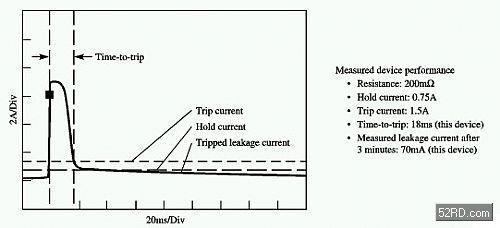 動作時間是PPTC在故障情況下對動作速度的特性所進行之描述。在小功率應用條件下,動作時間是關鍵因素,因為在整個系統的電壓降低或減弱且系統性能受到影響之前,小型電源維持在短路電流而不受損的時間可能很短。動作時間數值與元件的設計、元件的大小和工作電流性能有很大關系,且還要考慮到電路板設計;即電路板上較寬的連線或較大的焊接器等同于散熱器,均可增加動作時間??s小焊接器的尺寸,選擇較低的工作電流能夠改善動作時間性能。