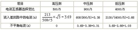 實例:一臺三相三繞組降壓變壓器,容量Se=40.5MVA,電壓110±2×2.5%kV/385±2×2.5%kV/11kV,接線方式:Ydd11-11,變壓器額定電流:213A/608A/2130A。主變差動保護采用BCH-2型差動繼電器?;居嬎闳绫?所示,已確定110kV側為基本側。
