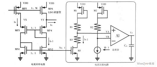 如圖1所示,電流采樣電路包括MP5、MP4、MP3、MN2和MN1。因為MP5和MP6均工作在飽和區,為了使MP5更好地等比例鏡像LDO的調整管(PMOS驅動管)MP6的電流,特使用MN1、MN2、MP3和MP4組成自偏置的鏡像陣列,以保證VX=VY,Vds_p5=Vds_p6。所以根據飽和區電流公式得到,N1I_p5=N1Is=N1Is1=I_p6。為使M3電流與Is更好的匹配,根據經驗值并考慮功耗因素,特意將MN1、MN2和M3的過飽和電壓提高到0.3V。