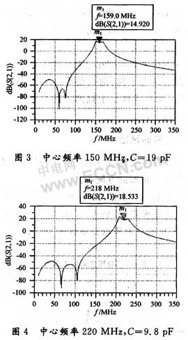 通常,電調諧濾波采用雙極點調諧濾波,諧振回路分為串聯諧振回路和并聯諧振回路,通過電感或電容進行耦合。此電調濾波器采用的是并聯諧振回路,用電感進行耦合。在進行仿真之前,需要建立仿真模型和設計各種參數?;谝陨夏P?,利用ADS軟件對電調濾波器進行電路設計和仿真。由于系統要求對該電調濾波器進行AGC控制,所以在仿真時加入雙柵FET。傳輸函數S21、頻率范圍設在10~350 MHz、電容在2.6~39 pF之間變化,仿真使用的放大器是NE25118。最終的ADS模型仿真結果如下面兩組曲線所示。若LC濾波器不使用放大器,仿真結果中可以看出濾波器的插損在2~3 dB左右。