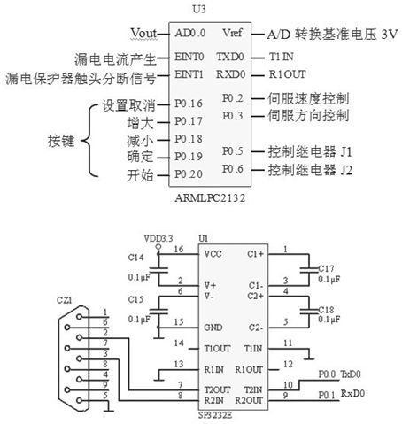 由于A/D轉(zhuǎn)換為10位,當(dāng)輸入電壓為5V時,輸出數(shù)據(jù)值為1024(4FFH),因此最大分辨率為0.0049V(5V/1024)。若產(chǎn)生測試電流的回路電阻為12Ω時,漏電電流的分辨率為0.4mA(0.0049V/12Ω),完全滿足測試需要。漏電保護(hù)器的漏電電流產(chǎn)生的開始信號和動、靜觸頭斷開信號分別送入LPC2132的外部中斷輸入端,采用中斷的方式對漏電保護(hù)器動、靜觸頭的分?jǐn)鄷r間進(jìn)行檢測。P0.5與P0.6腳分別控制繼電器J1、J2的閉合和分?jǐn)啵x擇三種不同測量范圍的測試電流。LPC2132與上位機之間采用串行通信,由于系統(tǒng)是3.3V系統(tǒng),所以要使用SP3232E進(jìn)行RS-232電平轉(zhuǎn)換。SP3232E是3V工作電源的RS-232轉(zhuǎn)換芯片。A/D轉(zhuǎn)換及控制電路如圖4所示。