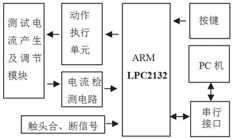 系統(tǒng)以LPC2132為核心,具有擴展測試電流的產(chǎn)生和調(diào)節(jié)模塊、動作執(zhí)行單元、電流檢測電路以及鍵盤等外圍設(shè)備。LPC2132是一個支持實時仿真和跟蹤32位ARM7TDMI-S核的微控制器,1個10位8路A/D轉(zhuǎn)換器,2個32位定時器/計數(shù)器,6路PWM單元輸出,2個硬件I2C接口和47個GPIO,2個16C550工業(yè)標(biāo)準(zhǔn)UART,以及多達(dá)9個邊沿或電平觸發(fā)的外部中斷。16kB的片內(nèi)靜態(tài)RAM和64kB的片內(nèi)Flash程序存儲器避免了LPC2132外擴存儲器,簡化了電路,提高了運行速度。漏電保護(hù)器的動作特性自動測試系統(tǒng)結(jié)構(gòu)框圖如圖1所示。