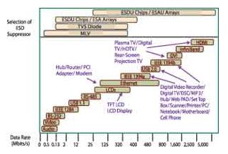 對于數據速率在350Mb/s或低于350Mb/s的應用,瞬態抑制二極管和多層壓敏電阻是提供保護的極好選擇。這些應用包括標清LCD顯示器、TFT顯示器,以及大多數的計算機周邊接口及連接。這些信號天生就允許高的插入損耗、高鉗位電壓和觸發電壓。鑒于電源引腳上并沒有任何信號,因此,高速抑制相應并不是必需的。瞬態抑制二極管和多層壓敏電阻也可以有效地保護像USB 2.0以及其他更高速率的接口電源引腳。但是,對于像DVI、HDMI、USB 3.0以及最新的IEEE 1394 A和B標準下的數據通信線路,實現最小信號失真的高速抑制響應對于系統性能和電路保護是至關重要的。這些應用包括數字視頻設備、MP3播放器、手機、 PDA、網絡交換器、有線和衛星電視機頂盒、打印機、掃描儀、復印機以及筆記本電腦和上網本等計算機設備。