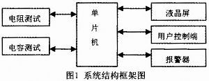 本文設(shè)計(jì)的電阻電容測試儀的系統(tǒng)結(jié)構(gòu)框架如圖1所示,系統(tǒng)主要由用戶控制端、單片機(jī)、液晶屏、電阻測試模塊、電容測試模塊、報(bào)警器以及其它附加功能模塊等組成。當(dāng)用戶需要測量某一電阻或電容的值時(shí),只需要把此電阻或電容放在相應(yīng)的測試位置,選擇好量程,測試儀即可自動測出其電阻值或電容值,并把測試結(jié)果顯示在液晶屏上,方便用戶讀取。另外,此測試儀還具有超出量程警示功能和記憶功能,可存儲最近十次的測量結(jié)果。