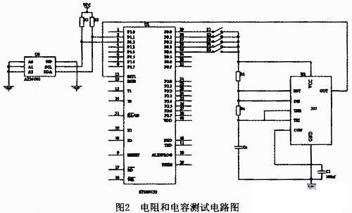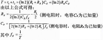 單片機(jī)測得振蕩輸出的頻率,計(jì)算后即可得到電阻和電容的值。不同量程對應(yīng)不同的電路參數(shù),利用開關(guān)可方便地選擇對應(yīng)不同量程的對應(yīng)電路。