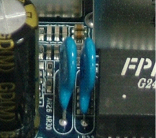 主板上小尺寸的貼片電容,我們無從判斷品牌,容值等參數,所以我們主要是去觀察那些大的插腳電容,主要分布在主電源模塊和CPU電源模塊,這個不難判斷,自己去找高樓林立的電容群吧。用料上來看,固態電解電容為上佳,如下圖藍色標記的電容,基本外觀是鋁殼包裝。但目前市場上,某些黑心廠商,為了使自己的產品能夠混淆視聽,也給普通的液態電解電容套上了鋁殼外衣,達到以次充好的目的。如下圖,黑色標記的鋁殼電容為看上去很像固態電解電容的液態電解電容,這個在一些廉價主板上應用的較多。