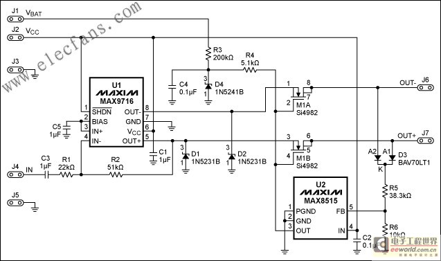 一個雙N溝道MOSFET斷開在回答有關任何輸出高電壓狀態下從線束放大器輸出。 MOSFET管(M1A及數M1B)一般上,用自己的驅動11V的齊納二極管的(4點)及其約11V的偏置元件。這種雙二極管D3提供了一個在每個輸出直流電壓二極管或連接,從而產生電壓,控制分流穩壓器U2樂隊(MAX8515)輸出。所示的電路U1的保護,一個1.4W功率AB類放大器(MAX9716)以上(聲音警告和汽車的司機的跡象)中提到的應用場合。