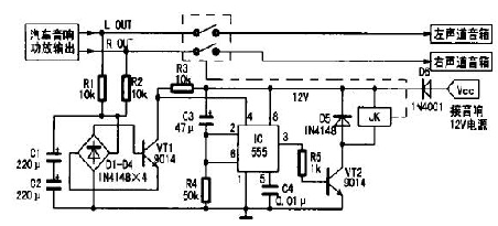 1.在接通音響電源的瞬間,因電容C3兩端電壓不能突變,可視為短路,則時基電路555的②、⑥腳電位高于2/3 Vcc,故555處于復位狀態(tài),③腳輸出低電平,晶體管VT2截止,繼電器JK常開觸點不動作。同時+12 V電壓通過電阻R4向電容C3充電,延時約5s(秒鐘)后555的②、⑥腳電位降低至1/3Vcc,555被觸發(fā)置位,③腳由低電平變?yōu)楦唠娖剑w管VT2導通,繼電器JK得電,常閉觸點閉合,從而實現(xiàn)了延遲一段時間將揚聲器接入功放,徹底消除了開機時大電流對揚聲器的沖擊;