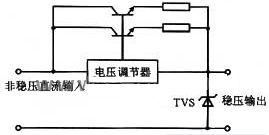 圖2是一個直流穩壓電源,在其穩壓輸出端加上TVS,可以保護使用該電源的儀器設備,同時還可以吸收電路中晶體管的集電極到發射極間的峰值電壓,從而保護晶體管。建議在每個穩壓源的輸出端增加一個TVS管,這樣可以大幅度地提高整機的可靠性。