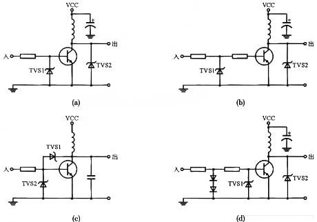 各種瞬變電壓能使晶體管的EB結或CE結擊穿而損壞,特別是晶體管集電極有感性(線圈、變壓器、電動機)負載時,通常會產生高壓反電勢,因而可能使晶體管損壞。在實際應用中,建議采用TVS作為保護器件。圖3所示為TVS保護晶體管的四種電路實例。