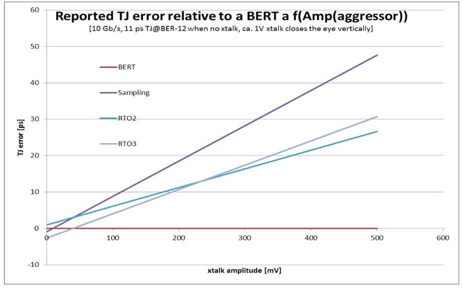 圖4 與BERT相比,示波器中的TJ誤差。(注: RTO = 實時示波器,采樣 = 等效時間示波器)