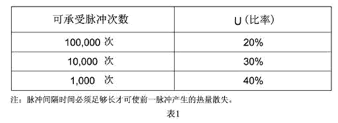 脈沖產生熱循環,從而產生機械疲勞影響保險絲管壽命。設計時應使脈沖I2T遠遠小于保險絲管標稱熔化熱能I2T。保險絲管壽命(可承載的脈沖循環次數)與U(脈沖I2T值之比率)的關系參照表1.本目錄提供的各種規格的保險絲管熔化熱能I2T可供參考,表2提供各種典型脈沖波形的I2T值近似計算公式: