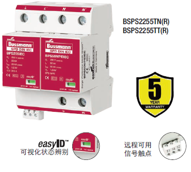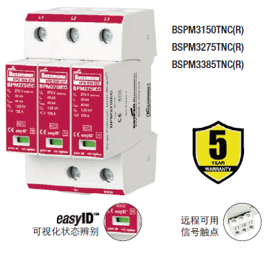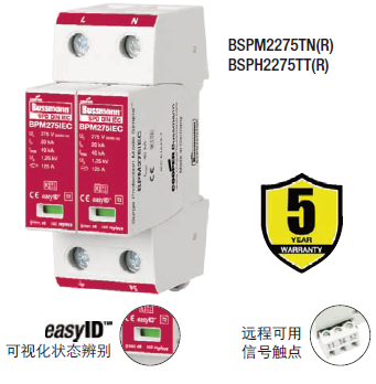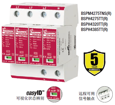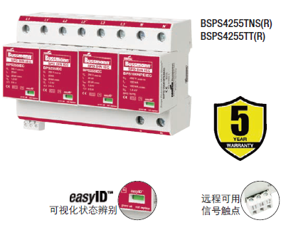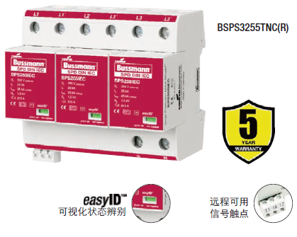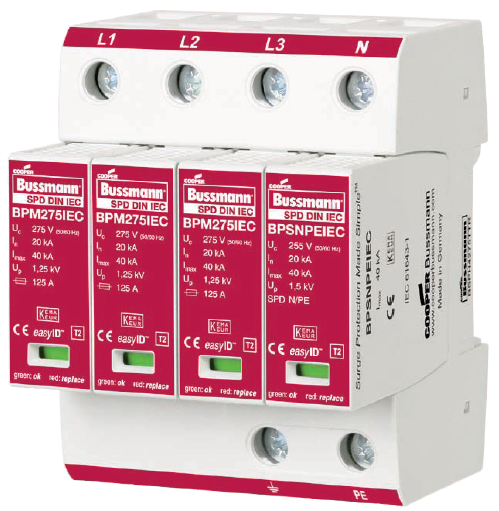 Cooper Bussmann IEC I級230伏、三極、結合了雷電流和浪涌保護器的模塊具有兩個特色:局部的、easyIDTM可視化辨別