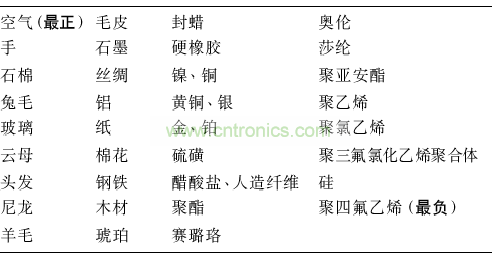 表1列出了不同材料摩擦起電的電荷特性,如玻璃、尼龍帶t1:電,硅、聚四氟乙烯帶負(fù)電。材料的導(dǎo)電性也對(duì)材料表面建立電荷的能力有影響,許多材料的導(dǎo)電性或表面電阻很大程度上取決于濕度,濕度越低導(dǎo)電能力越低,越容易阻止電荷的遷移使其停