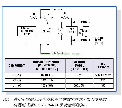 第二種方法是IEC 1000-4-2 >現(xiàn)已成為國(guó)際標(biāo)準(zhǔn)。相比Method 3015.7測(cè)試條件,它規(guī)定了更高的電容和更低的電阻}IE C 1000-4-2被廣泛地)II于測(cè)試終端設(shè)備的接口(表2)。值得一提的是> Maxim公司的模擬開(kāi)關(guān)和RS-232/RS-485接口IC完個(gè)符合這些ESD標(biāo)準(zhǔn),且無(wú)須外圍兒件。