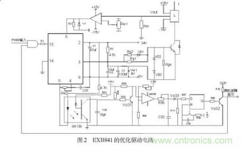 如圖2所示,用外接8V穩壓管Vw1代替驅動芯片內部的穩壓管Vz2,在穩壓管兩端并聯了兩個電容值分別為105μf和0.33μf的去耦濾波電容。為防止柵極驅動電路出現高壓尖峰,在柵射極間并聯了反向串聯的16V(V02)和8V(V03)穩壓二極管。為了改善控制脈沖的前后沿陡度和防止震蕩,減小IGBT 集電極的電壓尖脈沖,需要在柵極串聯電阻Rg。柵極串連電阻Rg要恰當,Rg過小,關斷時間過短,關斷時產生的集電極尖峰電壓過高;Rg過大,器件的開關速度降低,開關損耗增大。優化電路采用了不對稱的開啟和關斷方法。在IGBT開通時,EXB841的3腳提供+16V的電壓,電阻Rg2經二極管Vd1和Rg1并聯使Rg值較小。關斷時,EXB841內部的V5導通,3腳電平為0,優化驅動電路在IGBT的E極提供-8V電壓,使二極管V01截止,Rg= Rg1具有較大值。并在柵射極間并聯大電阻,防止器件誤導通。