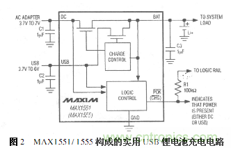 圖2是由MAX1551/1555構成的一種實用USB鋰電池充電電路。MAX1551/1555是MAXIM公司設計生產(chǎn)的USB單節(jié)鋰電池充電芯片,為5引腳薄型SOT23封裝,允許USB接口或者墻壁AC適配器3.7V~7V范圍的電壓輸入。芯片內部還具有溫度限制電路。