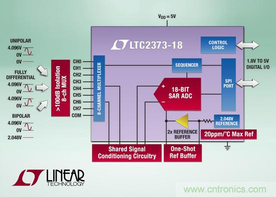 【導讀】近日,凌力爾特公司宣布推出具排序器的 18 位、1Msps、8 通道的逐次逼近寄存器 ADC LTC2373-18,該器件擁有卓越的 100dB SNR 性能。LTC2373-18 具可編程排序器,可存儲多達 16 個控制字,以配置多工器 (MUX) 和輸入范圍。