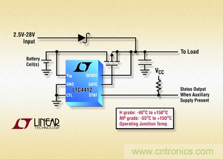 LTC4412 20mV 的正向電壓至少比肖特基二極管低 10 倍。因此,由于在那些需要于不同電源之間實現自動切換或負載均分的系統中大幅降低了功率損耗并減少了自發熱,該器件使效率提升了一個數量級。LTC4412 在大范圍使用條件下保證滿足性能規格要求,例如,在 2.5V 至 28V 工作電壓范圍內,工作結溫范圍達到 –55C 至 150C。