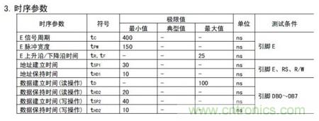 也許你還注意到了上面有許多關(guān)于時(shí)間的標(biāo)注,這也是個(gè)十分重要的信息,這些時(shí)間的標(biāo)注表明了某些狀態(tài)所要維持的最短或最長時(shí)間。因?yàn)槠骷墓ぷ魉俣纫彩怯邢薜模话愣几簧现骺匦酒乃俣龋运鼈冎苯又g要有時(shí)序配合。話說現(xiàn)在各種處理器的主頻也是瘋狂增長,日后搞不好出現(xiàn)個(gè)雙核單片機(jī)也不一定就是夢(mèng)話。下面是時(shí)序參數(shù)表: