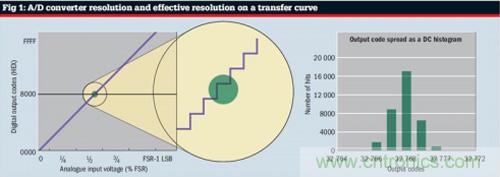 A/D轉換器的分辨率被定義為輸入信號值的最小變化,可通過一次計數改變數字輸出值。就理想的A/D轉換器而言,傳遞函數呈階梯狀,且每個步階寬度等于分辨率。但使用較高分辨率(16位或16位以上)的系統時,傳遞函數的響應和理想的響應之間將存在較大的偏差。這是因為由A/D轉換器及驅動器電路產生的噪聲可降低該轉換器的分辨率。
