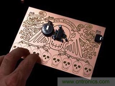 接著是跟前面的街頭涂鴉風(fēng)格完全不同的另一款迷你合成器電路板;電路板上并列的那一排骷髏是合成器的鍵盤,振蕩器(oscillator)的間距是由皮膚接觸的電平來控制。事實(shí)上,玩這個小東西的秘訣是,在開始彈奏之前先舔一舔(?!)指尖…