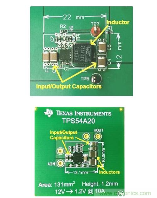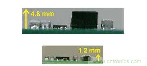 穩壓器尺寸的減小為我們提供了更多的機會。對比圖2中所示的高度剖面圖我們可以看到,常規降壓變換器的高度為4.8毫米,然而對于背面部件而言,這一高度遠超很多系統的高度限制。串聯電容降壓轉換器(1.2毫米高)的低斷面可以讓您將穩壓器置于電路板背面,這樣便可以釋放寶貴的頂側基板面。之前將整個10A轉換器置于其背面在之前不太現實,因為無源部件體積過大, 但如今有了TPS54A20,一切便成了可能。