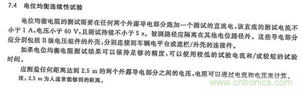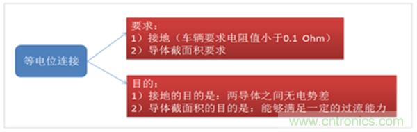 ③ISO 6469-3 Electrically propelled road vehicles-Safety specification-Part3:Protection of persons against electric shock GB/T 18384-3對等電位連接的設(shè)計(jì)要求、測試要求在標(biāo)準(zhǔn)6.3.1和6.9中做了明確規(guī)定。