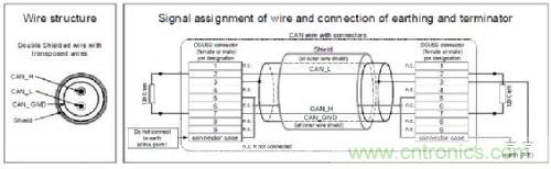 帶屏蔽層的CAN線,可以良好地抵御電場(chǎng)的干擾,等于整個(gè)屏蔽層是一個(gè)等勢(shì)體,避免CAN導(dǎo)線受到干擾。如圖9所示,為一個(gè)標(biāo)準(zhǔn)的屏蔽雙絞線,CANH和CANL通過(guò)鋁箔和無(wú)氧銅絲屏蔽網(wǎng)包裹,如圖9所示。需要注意的是和與接插件的連接,在連接部分允許有短于25 mm 的電纜不用雙絞。