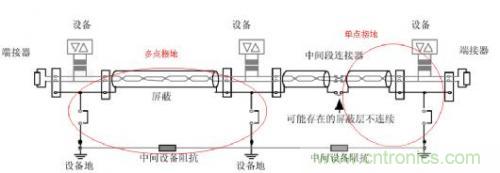 使用屏蔽線后,在屏蔽層沒(méi)有良好接大地前,屏蔽線是不起作用的。所以我們要選擇一種接地方式。通常來(lái)說(shuō),屏蔽層單點(diǎn)接地可以避免地回流(不同位置的地電位不同而導(dǎo)致的產(chǎn)生電流)、多點(diǎn)接地可以加快高頻干擾信號(hào)的泄放。所以要根據(jù)實(shí)際情況選擇合適的接地方式。如圖11所示。