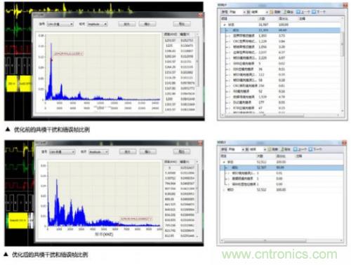 磁環(huán)的效果可以大大削減特定頻率的干擾強(qiáng)度,在增加磁環(huán)前,需要用CANScope或者示波器FFT快速傅里葉變化功能,測(cè)試出最高干擾的頻率,然后向磁環(huán)廠家定制對(duì)應(yīng)頻率的磁環(huán)。如圖14所示。為增加磁環(huán)前和增加磁環(huán)后的FFT的結(jié)果。可以看出干擾強(qiáng)度明顯減小。