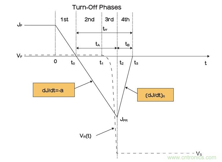 當二極管正向偏壓變成反向偏壓時,電流不會立即降至零值,因為消除通態期間儲存的電荷需要時間。因此,當t=t0時,二極管開始換向操作,電流開始下降,下降斜率(-a)恒定,外部電感和電源電壓是決定斜率的唯一因素。在t1之前,二極管被施加正向偏壓,從t1到t2,二極管壓降上升,達到電源電壓;在t=t2時,反向電流達到最大值。間隔(t3-t0)被稱為反向恢復時間(trr),而負電流與零線之間的區域是反向恢復電荷(Qrr)。tB期間的電流斜率主要與產品設計和硅特性有關。