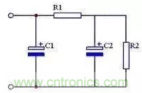 使用兩個電容和一個電阻組成RC濾波電路,又稱π型RC濾波電路。見圖20所示。這種濾波電路由于增加了一個電阻R1,使交流紋波都分擔在R1上。R1和C2越大濾波效果越好,但R1過大又會造成壓降過大,減小了輸出電壓。一般R1應遠小于R2。