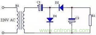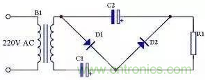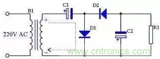 前面介紹的三種整流電路輸出電壓都小于輸入交流電壓的有效值,如果需要輸出電壓大于輸入交流電壓有效值時可以采用倍壓電路,見圖12。由圖13可知,在電源的正半周,變壓器B1次級上端為正下端為負,D1導通,D2截止,C1通過D1充電,充電后C1兩端電壓接近B1次級電壓峰值,方向為左端正右端負;由圖14可知,在電源的負半周,變壓器B1次級上端為負下端為正,D1截止,D2導通,C2通過D1充電,充電后C2兩端電壓接近C1兩端電壓與B1次級電壓峰值之和,方向為下端正上端負。由于負載R1與C1并聯,當R1足夠大時,R1兩端的電壓即為接近2倍B1次級電壓。