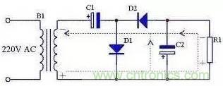 二倍壓整流電路還有另外一種形式的畫法,見圖15,其原理與圖12完全一致,只是表現形式不一樣。