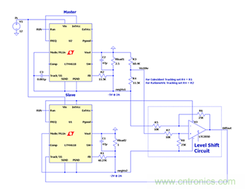 TRACK引腳輸入允許μModule穩(wěn)壓器通過將跟蹤信號(hào)(即,主μModule穩(wěn)壓器的輸出電壓軌的分壓版本)提供給從μModule穩(wěn)壓器的TRACK引腳來跟蹤另一電源軌的輸出電壓斜坡。每個(gè)μModule穩(wěn)壓器內(nèi)部控制器所看到的TRACK引腳電壓與其μModuleGND引腳相關(guān),但在需要配置兩個(gè)負(fù)輸出轉(zhuǎn)換器進(jìn)行跟蹤的應(yīng)用中,μModule穩(wěn)壓器的GND引腳可以處于不同的電位。主和從GND引腳電位差異意味著主設(shè)備提供的跟蹤信號(hào)不能直接施加到從設(shè)備的跟蹤引腳。在這些類型的應(yīng)用中,需要額外的考慮以確保從機(jī)相位能夠看到來自主機(jī)相位的正確參考的跟蹤信號(hào)。