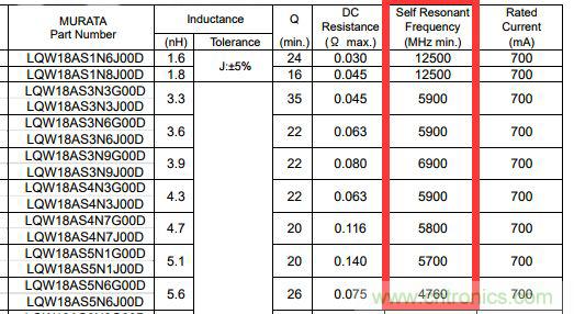 C0G/NP0類的低損耗電容和高Q值RF繞線電感datasheet中一般都會主動標出自諧振頻率的具體值和測試方法。簡單地說,電容在低于自諧振頻率的區間內才有作為容性元件的利用價值,電感在自諧振頻率內才有作為電感的利用價值。