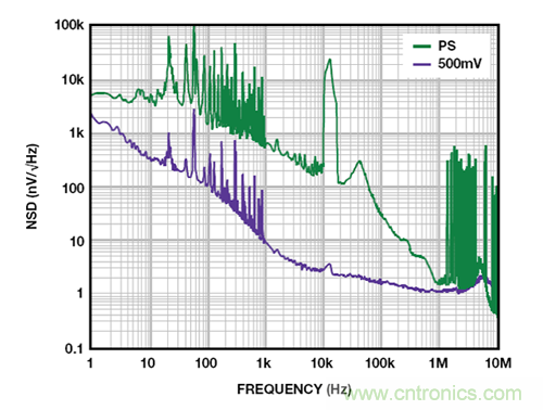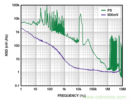 如 ADM7150 超低噪聲、高 PSRR 調(diào)節(jié)器一類的新型 LDO 實(shí)際上級聯(lián)了兩個 LDO,因此,結(jié)果得到的 PSRR 約為各個級之和。這些 LDO 要求略高的裕量電壓,但能夠在 1 MHz 條件下實(shí)現(xiàn)超過 60 dB 的 PSRR,較低頻率下,PSRR 可以遠(yuǎn)超 100 dB。圖 7 所示為一個 5 V 的 ADM7150 的噪聲頻譜密度,其負(fù)載電流為 500 mA,裕量為 800 mV。10 Hz 至 100 kHz 范圍內(nèi),輸出噪聲為 2.2 μV rms。隨著裕量降至 600 mV,整流諧波開始顯現(xiàn),但當(dāng)輸出噪聲升至 2.3 μV rms 時,其對噪聲的影響很小。