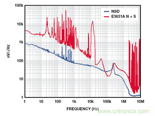 圖 4 展示的是 2.5 V ADM7160 在 500 mV 裕量和 100 mA 負(fù)載條件下,相對于 E3631A 臺式電源的輸出噪聲,該臺式電源在 20 Hz至 20 MHz 范圍內(nèi)的額定噪聲低于 350 μV-rms。1 kHz 以下的許多雜散為與 60 Hz 線路頻率整流相關(guān)的諧波。10 kHz 以上的寬雜散來自產(chǎn)生最終輸出電壓的 DC-DC 轉(zhuǎn)換器。1 MHz 以上的雜散源于環(huán)境中與電源噪聲不相關(guān)的 RF 源。在 10 Hz 至 100 kHz范圍內(nèi),這些測試所用電源的實(shí)測噪聲為 56 μV rms,含雜散為104 μV。LDO 抑制電源上的所有噪聲,輸出噪聲約為 9 μV-rms。