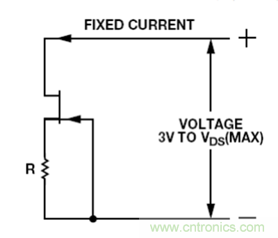 若精度不是問題,且只要求剛性單極性電流源,則可以采用耗盡型JFET和一個電阻組成電流源。如圖 12 所示,這種配置在溫度發生變化時并不十分穩定,且對于給定的R值,各器件的電流可能有相當大的差異,但該配置簡單而廉價。