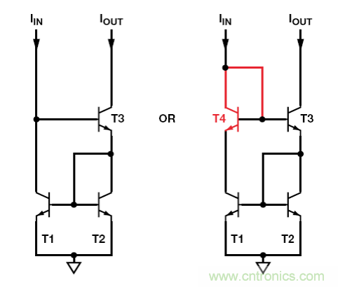 若早期電壓影響很大,則可使用略為復雜的威爾遜電流鏡降至最低。3 晶體管和 4 晶體管版本如圖 3 所示。4 晶體管版本更為精確,且具有更寬的動態范圍。