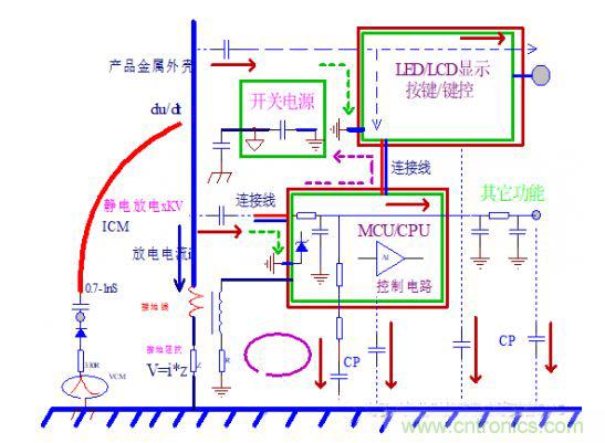 1、靜電釋放于機(jī)殼,由于沒有理想的接地,會在機(jī)殼上建立電壓V。