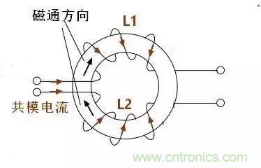 顯然,流過L1的共模電流和流過L2的共模電流產生磁通相互疊加,總磁通增加。L1和L2除了自感以外還有互感,L1的電感量除了本身的電感外還要加上L2的互感,反之L2也一樣。